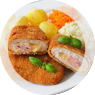 Kotlet po szwajcarskuKotlet wieprzowy, frytki, zestaw surówek