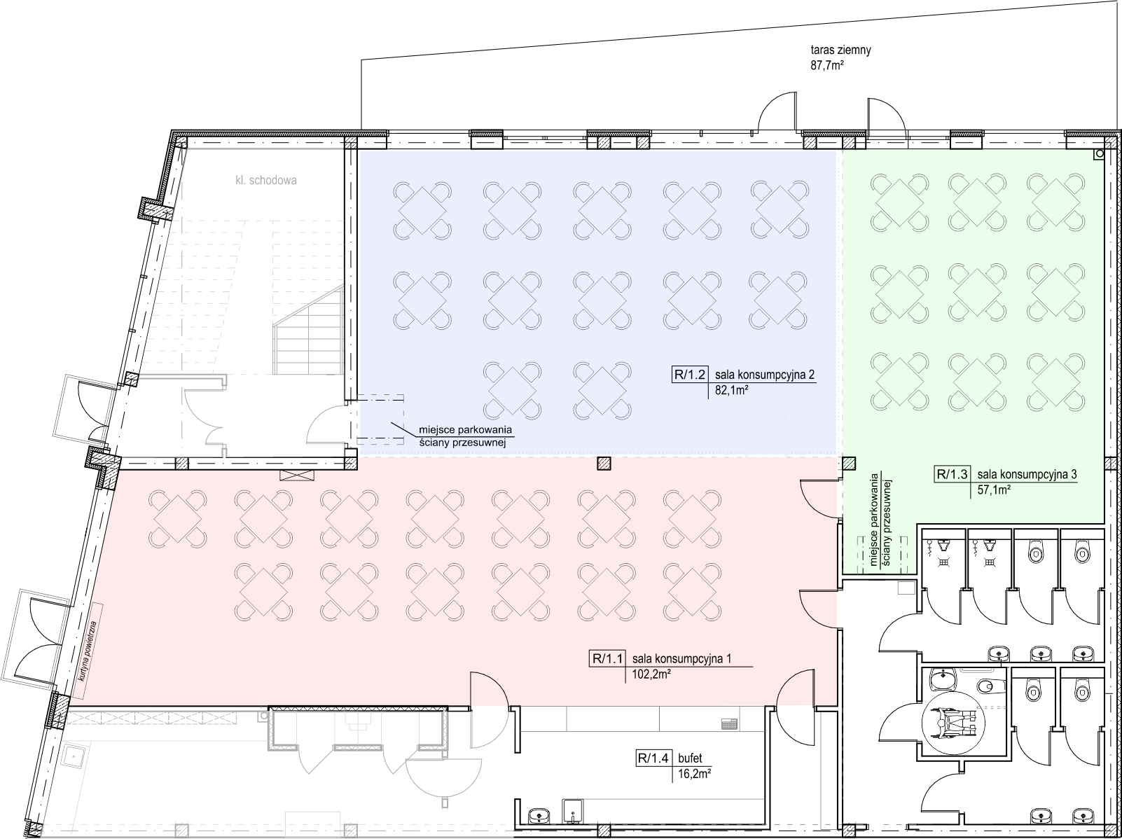 Istnieje możliwość zmiany konfiguracji ścian i w mirę potrzeb wydzielenia trzech osobnych, mniejszych sal.